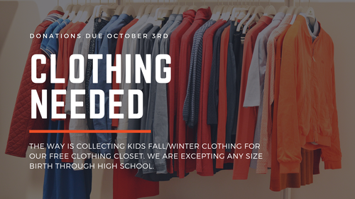 Please donate gently used, freshly laundered, and folded clothing. We are excepting all sizes birth through high school. Donations are due by October 3rd!